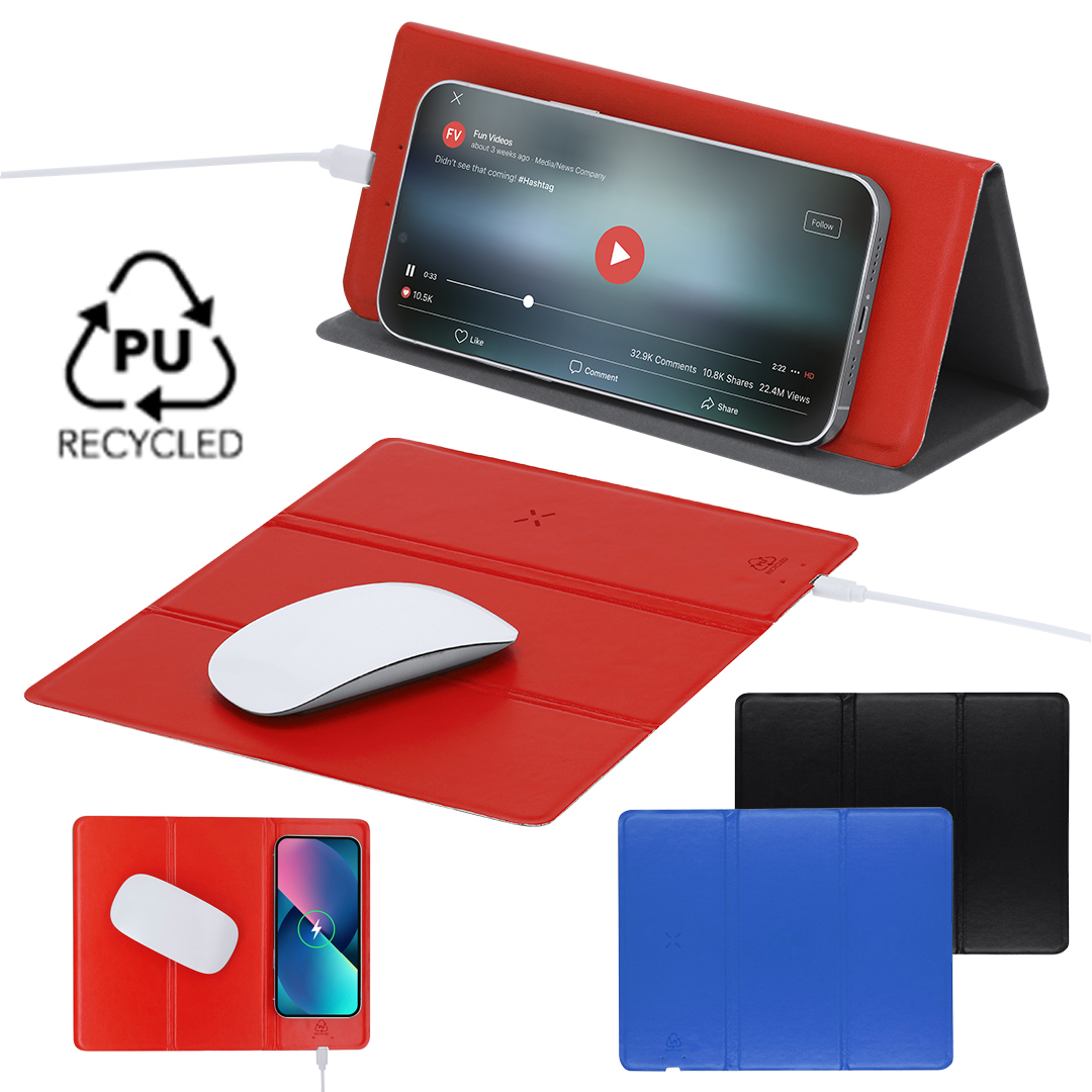 Alfombrilla plegable fabricada en suave PU Reciclada. Con cargador inalámbrico integrado de 10W. Compatible con dispositivos equipados con tecnología de carga inalámbrica. Base antideslizante y soporte multiposición para smartphone. Disponible en variados colores lisos. Con distintivo PU reciclado.La PU reciclada destaca por su resistencia y elasticidad. Este material reciclado y reciclable es una opción sostenible que rescata las fibras desechadas en los procesos de fabricación, minimizando así el desperdicio de material y contribuyendo a su vez a reducir el impacto ambiental, manteniendo a la vez sus propiedades originales.Fabricado conforme a los estándares RoHS y en cumplimiento con los siguientes requisitos de seguridad: Sistema de protección contra sobrecalentamiento. Sistema de protección contra sobrecarga. Sistema de bloqueo para evitar cortocircuitos. Inalámbrico 10W. Plegable. Antideslizante