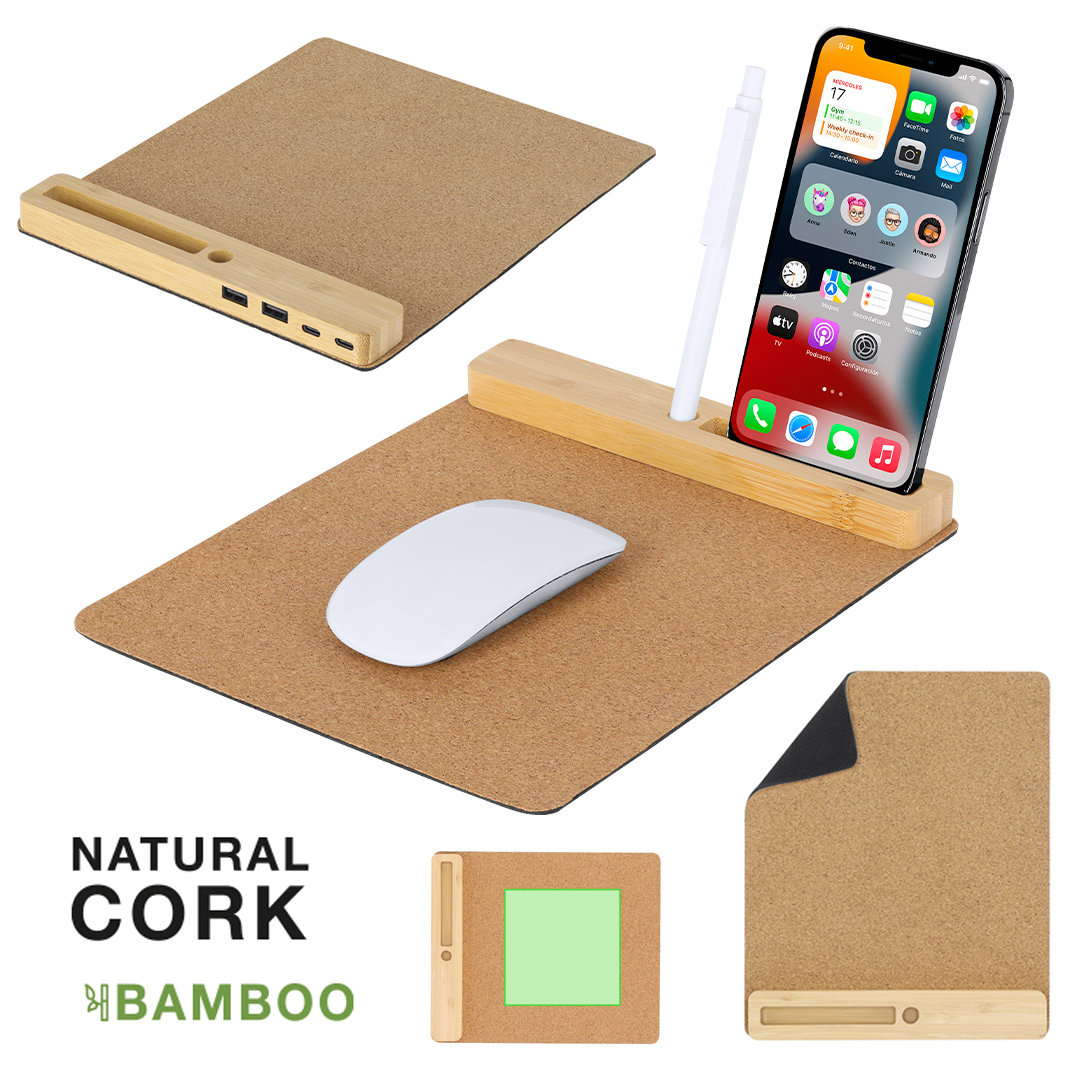 Alfombrilla multifunción fabricada en combinación de suave corcho y bambú. Flexible y con entrada Tipo C -cable incluido-, una salida Tipo C, y dos salidas USB; con función de sincronización de datos. Incluye soporte para smartphone y soporte para bolígrafos en la base de bambú. Es antideslizante y estable, garantizando una confortable experiencia de uso.Elaborado con elementos vegetales para así fomentar la utilización de materias primas naturales y reducir las emisiones contaminantes.Materiales como el bambú fomentan la utilización de materias primas naturales reduciendo las emisiones contaminantes. Además, el bambú proviene de una planta de gran resistencia y versatilidad, con crecimiento y regeneración rápida, siendo una excelente alternativa al uso de madera tradicional. 1 Puerto Tipo C. 2 Puertos USB 2.0. Antideslizante
