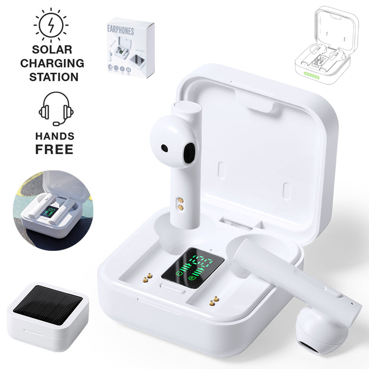 Auriculares intraurales en elegante acabado blanco y conexión Bluetooth® 5.0. Con panel de carga solar integrado en la tapa y pantalla LCD interior con indicador de estado de carga. De diseño ergonómico, incluyen botón de control integrado en el auricular, con base a juego. Función manos libres y recargables con energía solar o mediante cable micro USB -incluido-. Presentados en estuche individual premium con apertura de bisagra y en atractiva caja de diseño, con manual de instrucciones en español e inglés. Conexión Bluetooth. Carga Solar. Batería 40 mAh/ Base Carga 260 mAh
