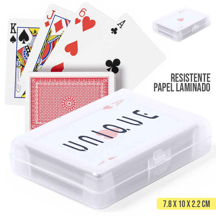 Baraja francesa fabricada en resistente papel laminado. Incluye 54 naipes, presentados en estuche individual de acabado translúcido y con cierre de seguridad. 54 Cartas