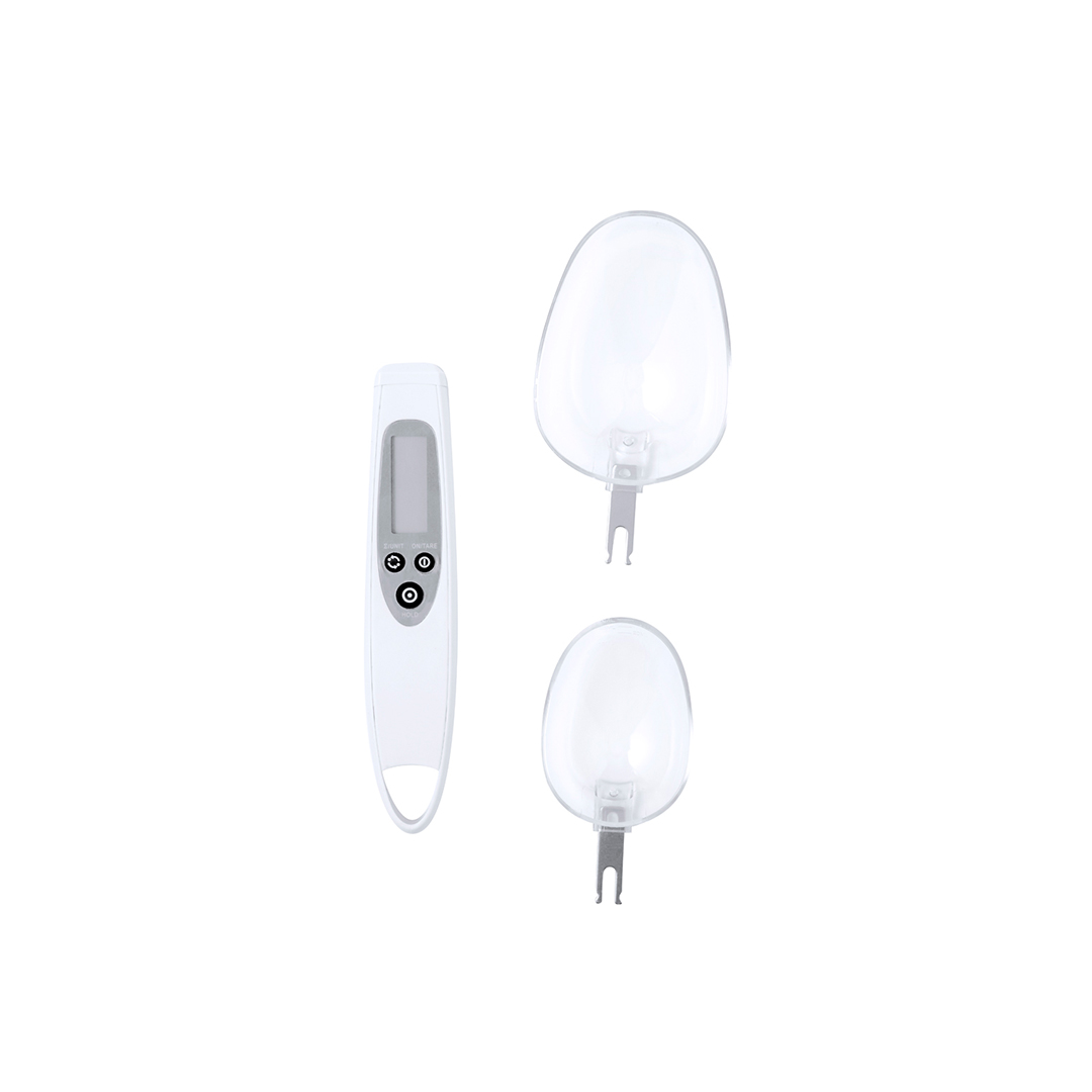 Práctica báscula digital con cuchara, válida para líquidos y sólidos. Incluye 2 cucharas intercambiables y pantalla digital LCD situada en el mango, mostrando el pesaje con una precisión de 0,1g. Botón para mostrar el peso en gramos (g), onzas (oz), o mililitros ( ml), con función de memoria y posibilidad de pesar dos ingredientes. Ambas cucharas llevan grabada una escala de medición adicional para líquidos: la cuchara pequeña desde 5 ml hasta 25 ml; y la cuchara grande desde 10 ml hasta 50 ml. Con manual de instrucciones en español e inglés. Alimentada por pila de botón (incluida) y presentada individualmente en caja de diseño kraft. 2 Accessorios 50 ml y 25 ml. Max 300 g. Pila Botón Incluida