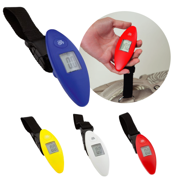 Práctica báscula digital para equipaje en vivos colores. Con pila de botón incluida y peso máximo de 40kg. Max 40 Kg. Pila Botón Incluida