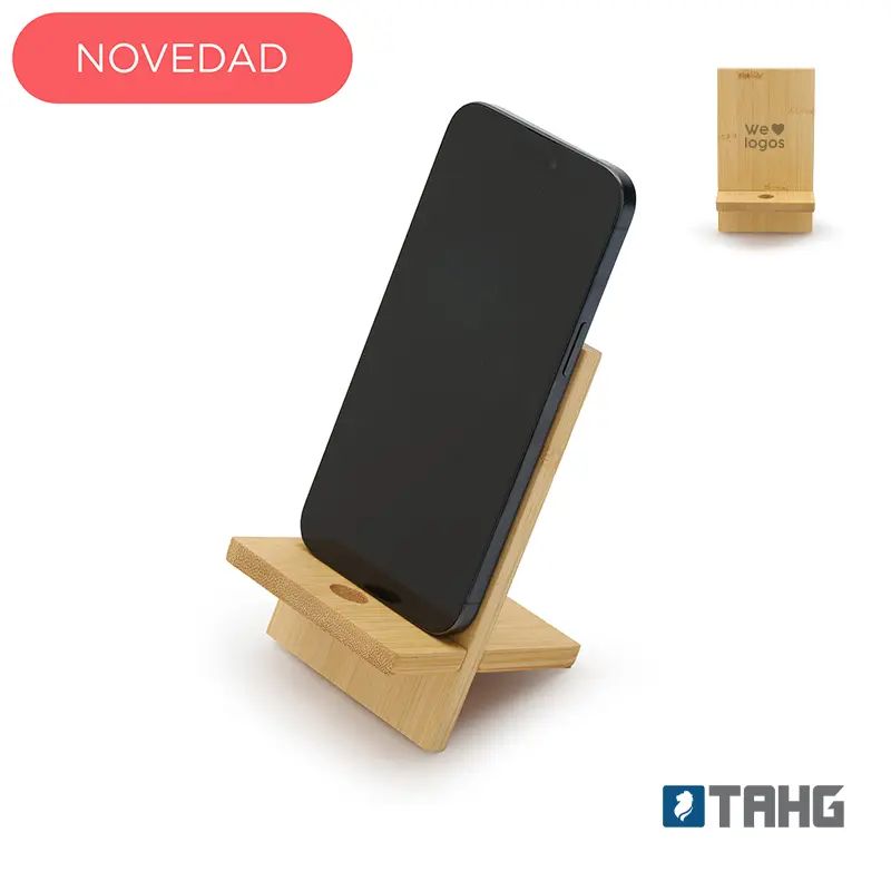Soporte para teléfono fabricado en bambú. Incluye un orificio que permite el paso del cable facilitando la carga del dispositivo mientras está en uso.