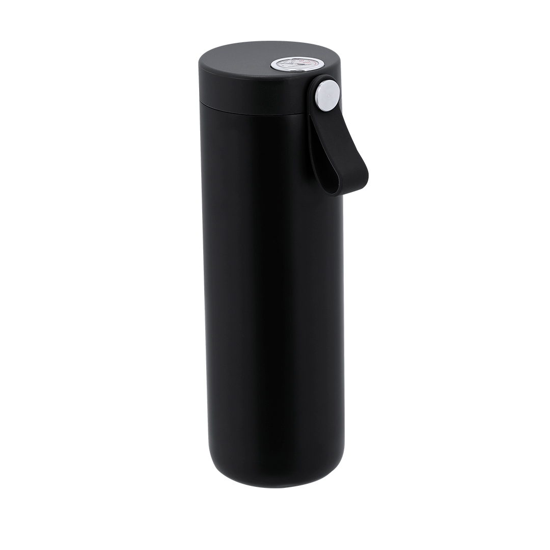 Bidón térmico de acero inox y doble pared de 500 ml de capacidad, con medidor de temperatura analógica, con rango de 0º a 100º. Con tapón de seguridad, asa de silicona integrada y cuerpo a juego. Libre de BPA. 500 ml. Medidor Temperatura