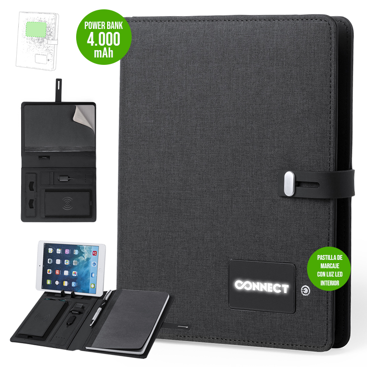 Elegante y práctico organizador en poliéster 300D. Con carga inalámbrica y batería auxiliar de 4.000 mAh de capacidad de carga integrada. Pastilla de marcaje con luz led interior y un recubrimiento exterior especialmente diseñado para marcaje en láser, con el que conseguirá que su publicidad o marca quede iluminada con luz blanca. De sobrio diseño y original cierre, incluye bloc de notas de 64 hojas, soporte para bolígrafo e indicador led de estado de carga. El fácil acceso a la estación de carga mediante cable micro USB -incluido- hacen de este organizador el gadget perfecto para el mundo de los negocios. Las capacidades mostradas en todas nuestras baterías auxiliares externas son reales, incorporando todas ellas baterías de grado A y no recicladas, con una vida útil de al menos 500 ciclos de carga y según normativa CE. Además, están fabricadas conforme a los estándares RoHS y en cumplimiento con los siguientes requisitos de seguridad: Sistema de protección contra sobrecarga del power bank. Sistema de protección contra descarga completa que proporciona una mayor durabilidad del power bank. Sistema de bloqueo para evitar cortocircuitos. Sistema de transferencia de carga constante, acorde con la capacidad del dispositivo de destino. Luces Led. Inalámbrico 5W. Power Bank 4000 mAh. Bloc 64 Hojas. Salida USB. Entrada Micro USB