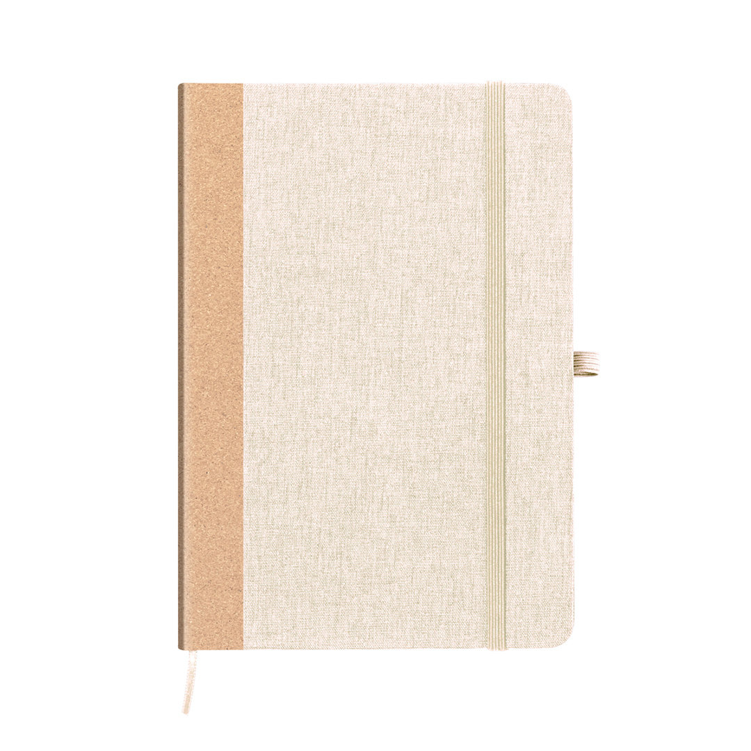 Bloc de notas con tapas rígidas fabricadas en RPET, con el lomo en corcho. Incluye interior con 80 hojas lisas, marcapáginas, elástico de cierre y soporte para bolígrafo a juego. logotipo RPET en contraportada y disponible en elegantes colores. Presentado en una bolsa individual de papel reciclado. El material RPET se elabora a partir de plástico reciclado, para así fomentar la reutilización de residuos plásticos y ayudar a la sostenibilidad del planeta. 80 Hojas