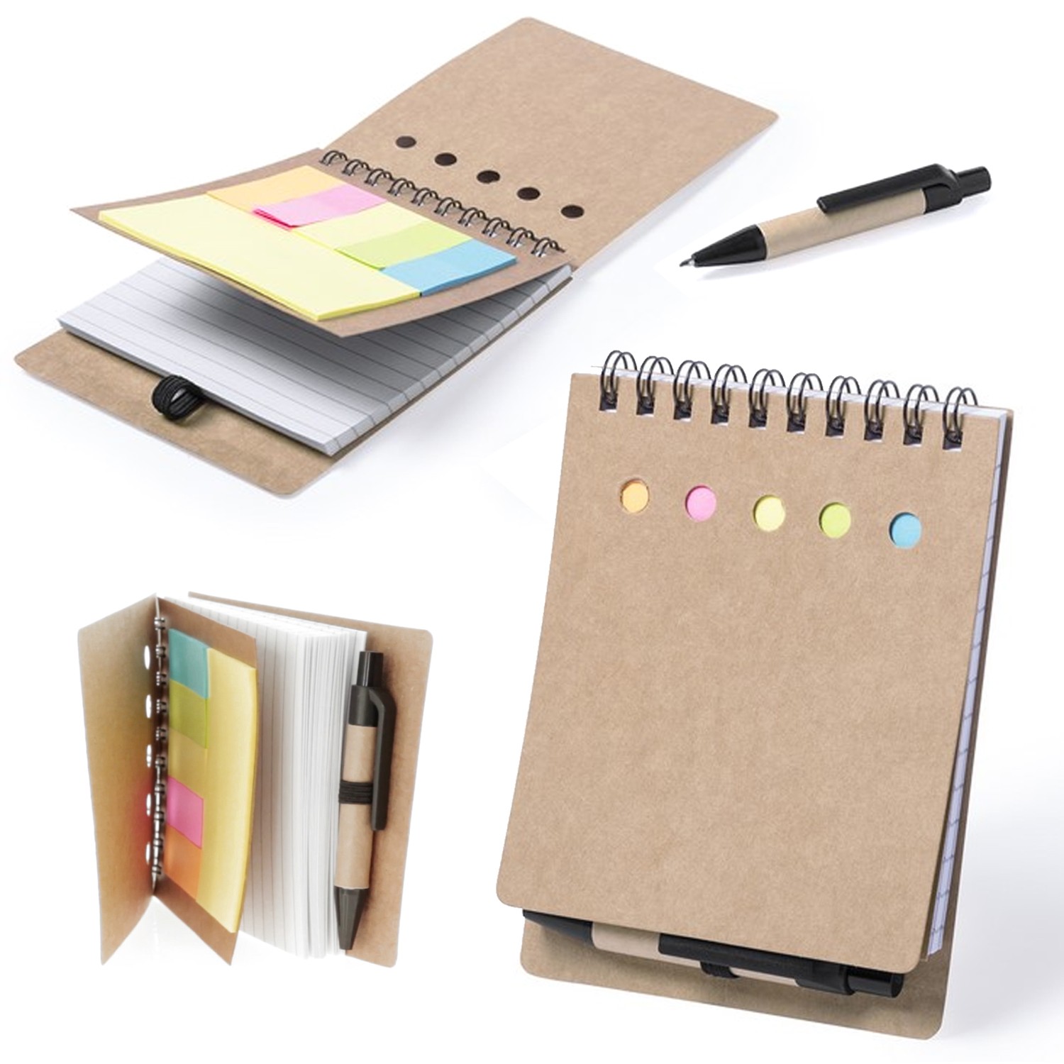 Bloc de notas adhesivas de anillas con bolígrafo de cartón reciclado incluido. Con tapas de suave tacto acabadas en resistente cartón reciclado rígido con troquelado. Con bloc de 50 hojas de distribución a una raya, 15 notas adhesivas grandes y 75 mini notas adhesivas. Bolígrafo con tinta azul. 50 Hojas. 15 Notas Adhesivas 4,4 x 7,5 cm. 75 Mininotas Adhesivas 1,4 x 4,4 cm. Bolígrafo Cartón Reciclado Incluido
