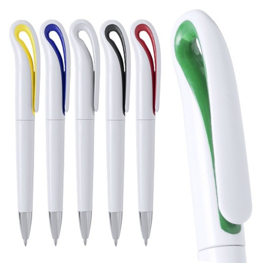 Bolígrafo de mecanismo giratorio de atrevido diseño bicolor con accesorios en vivos colores sólidos y cuerpo de suave acabado en color blanco sólido. Con original clip curvado y punta de acabado plateado brillante. Tinta azul.