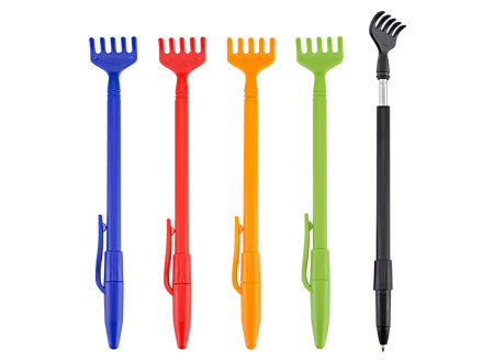 Bolígrafo plástico de color con tapa, con Manito Rascadora expansible (tipo antena). Escritura azul.