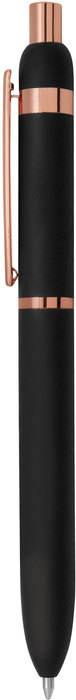 Metal. Cuerpo de aluminio, acabado engomado color negro, muy suave al tacto. Bolígrafo retráctil. Clip, botón y anillos metálicos color cobre. Tinta Azul. Decapa cobre tanto en el cuerpo como en la tapa. Presentación en caja de regalo.