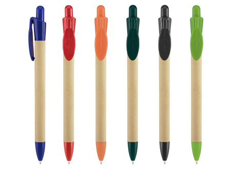 Bolígrafo Ecológico "Leave" con cuerpo de cartón reciclado y clip plástico PET biodegradable con forma de hoja. Escritura azul.