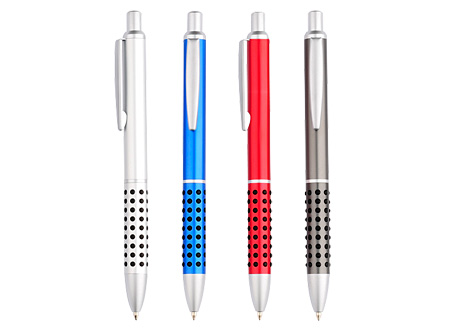 Bolígrafo metálico satinado modelo "Caterpillar", con lunares de goma negra que brindan una suave sensación de masaje dactilar al escribir. Escritura azul.