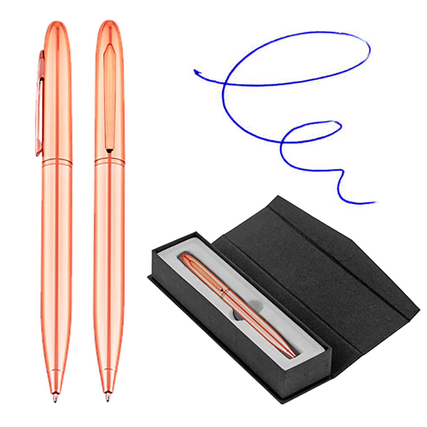 Bolígrafo metálico electro plateado en color cobre de finas terminaciones. Acabado brillante. Presentación en estuche negro premium.