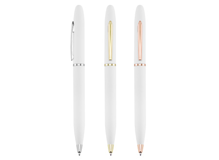 Fino bolígrafo Metálico blanco modelo "Trooper", con terminales metálicos. Diseño simple y moderno. Escritura negro.