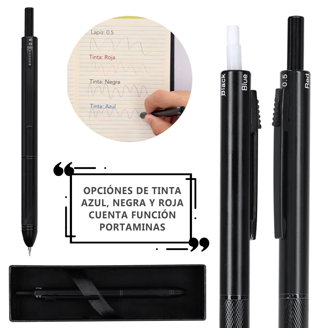 Bolígrafo portaminas 4 en 1, con ingenioso mecanismo de uso. La posición del pulsador permite seleccionar el color de la tinta o la función portaminas. Fabricado en resistente aluminio. Opciónes de tinta azul, negra y roja. Cuenta función portaminas. Incluida 1 mina de 0,5mm. Con goma integrada en el pulsador. Con empuñadura ergonómica y clip a juego. Escritura 3 Colores. Mina 0,5 mm Incluida
