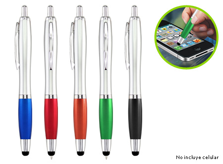 Bolígrafo plateado "New Satin Touch-Screen" con goma negra para pantalla táctil. Escritura azul.