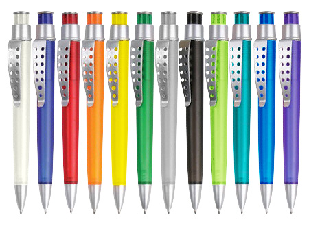 Bolígrafo plástico color frozen modelo "Evolution" con clip metálico con orificios. Escritura azul.
