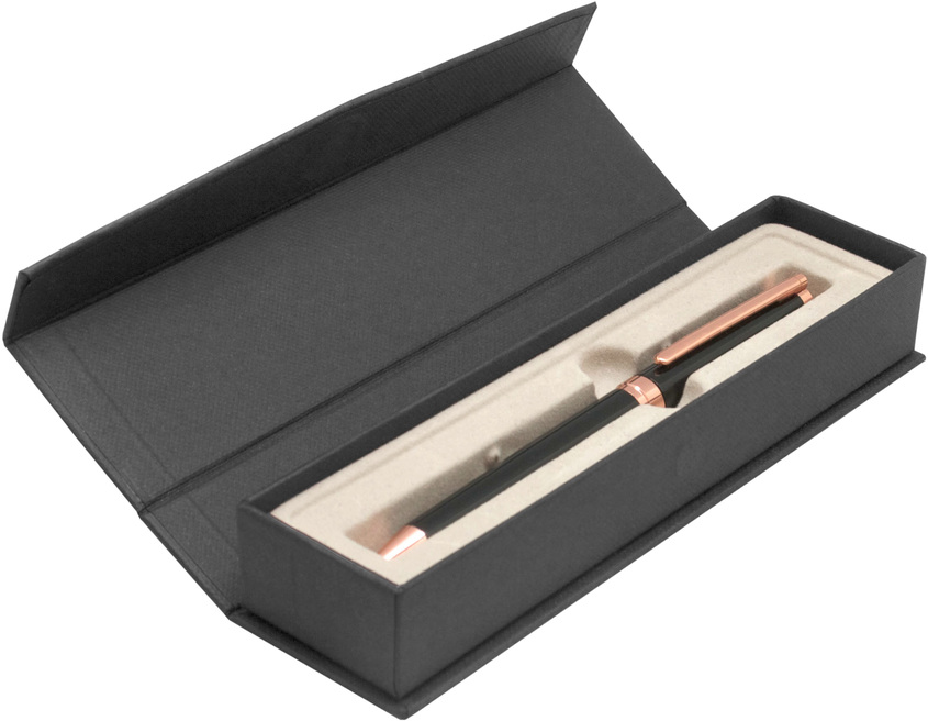 Metálico. Bolígrafo con apertura giratoria. Destape cobre en la parte de arriba. Cuerpo negro. Detalles en clip, arco circular y punta color cobre. Tinta negra. Presentación en caja de regalo.
