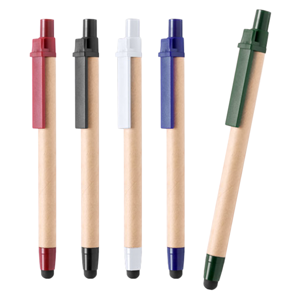 Bolígrafo puntero de mecanismo pulsador en original combinación de cuerpo en cartón reciclado de color natural y accesorios en vivos colores con puntero negro. Tinta azul.