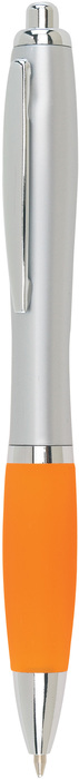 Plástico. Cuerpo curvo, pulsador, clip y puntera color plata. Grip de goma de color. Retráctil. Tinta negra.