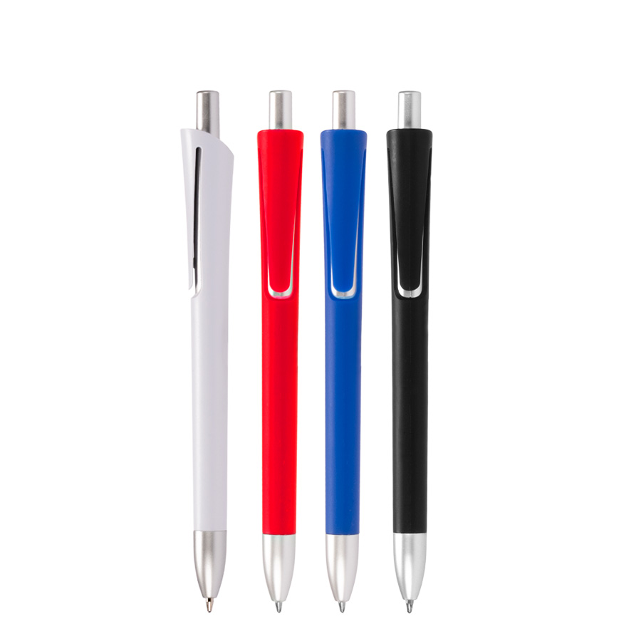 Bolígrafo plástico con cuerpo de color mate y terminales plateados. Escritura azul.