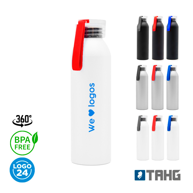 Sport Bottle realizada en aluminio, incluye banda colgante de silicona en colores. Medidas: 23 cm x Diámetro 6,5 cm. Capacidad: 600 ml. Tahg.LOGO24: Producto disponible para el servicio de logueo en 24 horas respetando unidades mínimas de logueo y 200 unidades máximas. Consultar términos y condiciones del servicio