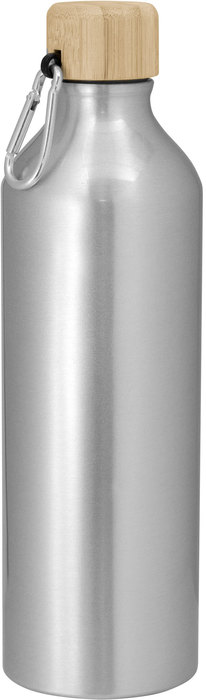 Botella de aluminio. Tapa a rosca de bambu con anillo de silicona y con mosquetón (gancho carabinero) en color plateado.