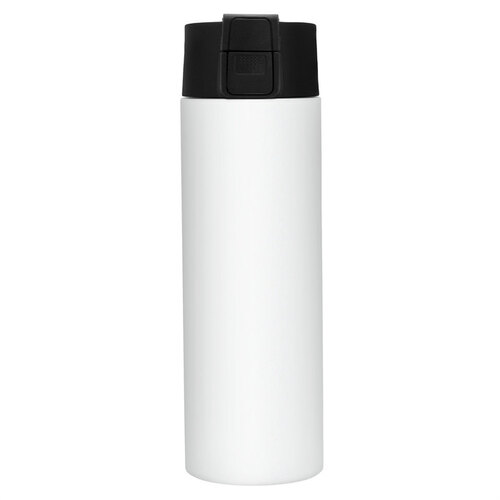 Ø 7 cm x 23 cm. Acero inoxidable. Capacidad 450 ml. Botella doble pared, sellada al vacío. Interior de acero 304 y exterior de acero 201. Pintura color blanco brillante apta para sublimado. Tapa en PP con traba de seguridad y botón pulsador de apertura. Mantiene por más de 12 hs la temperatura de las bebidas calientes y 24 hs de las bebidas frías. Presentación en caja de regalo kraft.