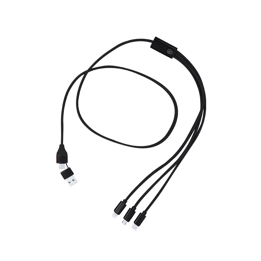 Cable cargador en Aluminio Reciclado. Con conexión de entrada dual Tipo C/USB y salidas Tipo C, Lightning y Micro USB. Incluye distintivo Aluminio Reciclado.El Aluminio Reciclado es un material con posibilidades de reciclaje casi infinitas, sin perder sus propiedades originales y consumiendo menos energía en este proceso.Certificación GRS (Global Recycled Standard / Estándar de Reciclaje Global), que garantiza el origen reciclado del material usado para fabricar el producto.Conexión Micro USB, Tipo C y Lightning 5V DC 2.4A Conexión Micro USB, Tipo C y Lightning 5V DC 2.4A