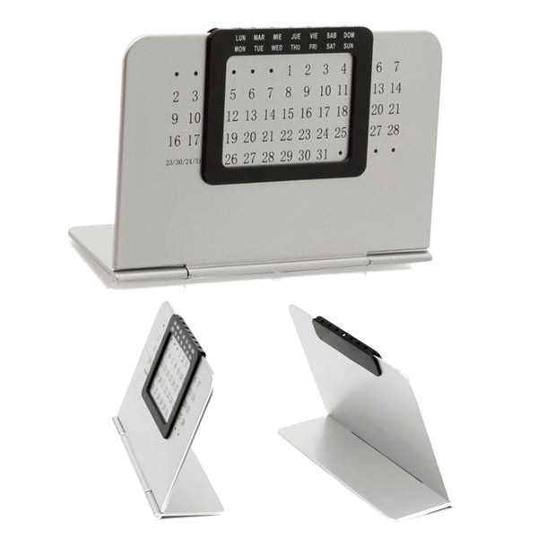 Calendario perpetuo de cuerpo en suave acabado y con soporte plegable. Con banda inferior para marcaje en tampografía.