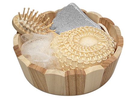 Canasto SPA de belleza en madera modelo "Naturals". Contiene cepillo de pelo, esponja malla, piedra pomez y esponja de masaje corporal.