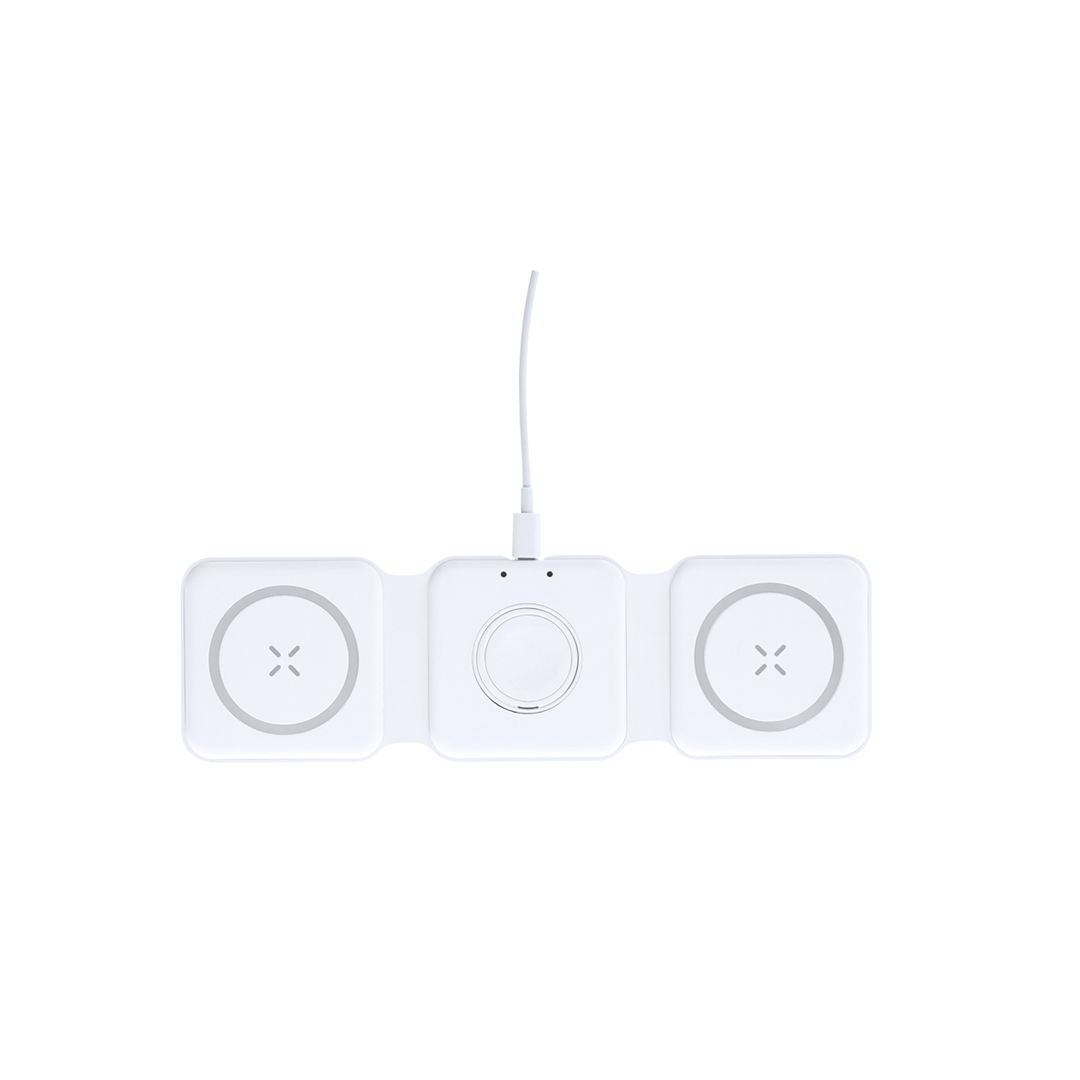 Completo cargador inalámbrico magnético 15W, diseñado para la carga simultánea del smartphone, auriculares y smartwatch. Un gadget todo en uno: plegable, portátil, de tamaño compacto, muy versátil y de diseño funcional. Conexión por usb Tipo C -cable incluido- y elaborado en resistente ABS de color blanco. Fabricado conforme a los estándares RoHS y en cumplimiento con los siguientes requisitos de seguridad:Sistema de protección contra sobrecalentamiento.Sistema de protección contra sobrecarga.Sistema de bloqueo para evitar cortocircuitos. Inalámbrico 15W. Magnético