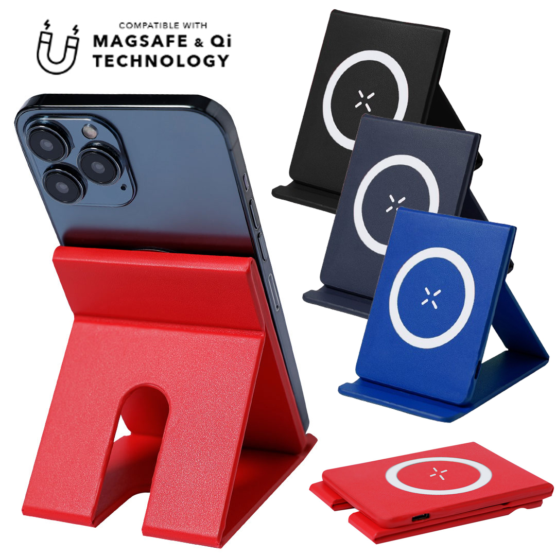Cargador inalámbrico magnético 15W, fabricado en PU. Incluye soporte plegable, con posibilidad de varias posiciones del smartphone, e indicador de estado de carga. Compatible con terminales equipados con tecnología de carga inalámbrica. Contiene cable de carga USB de 1m, con conector de entrada Tipo C, y anillo metálico con adhesivo. Disponible manual de instrucciones en español e inglés. Inalámbrico 15W. Magnético. Plegable