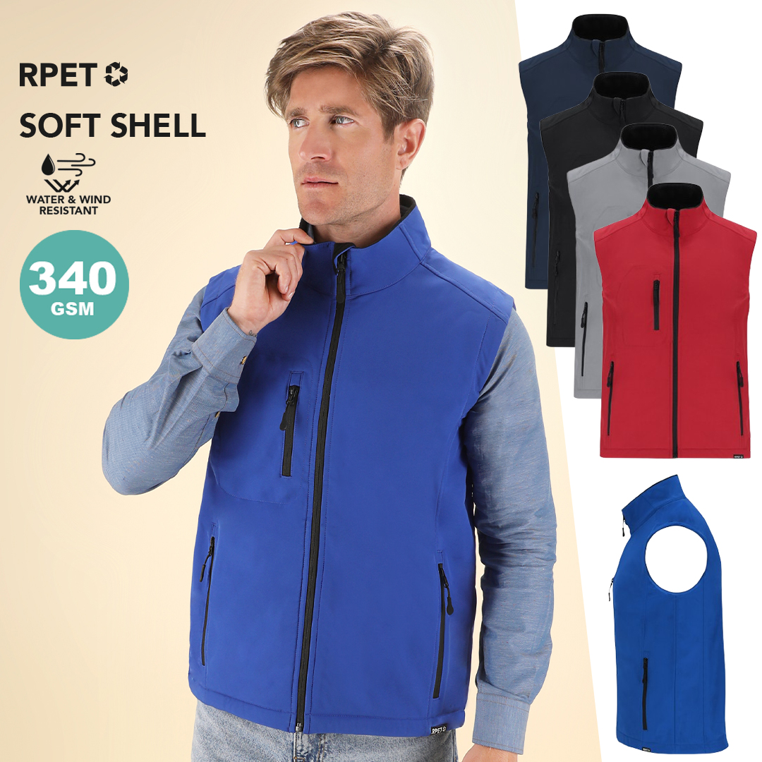 Chaleco Soft Shell RPET confeccionado en 3 capas, de 340 g/m2. Con membrana de 8000mm, impermeable y transpirable. Exterior en Soft Shell e interior en tejido polar microfleece en color negro. Con bolsillo exterior en pecho derecho y dos bolsillos laterales con cremalleras. Con cremallera central y cremalleras invertidas en bolsillos, incluyendo tiradores de cordón en color negro. Cuenta con protector de barbilla a juego y cintura ajustable, con cordón elástico y tope. Distintivo RPET en el ribete de la prenda. Resistente al Viento y al Agua
