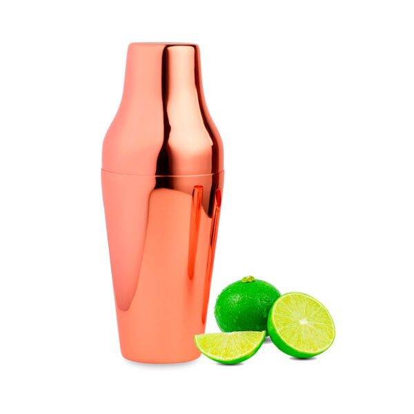 Coctelera metálica cobrizada, presentación en caja individual.