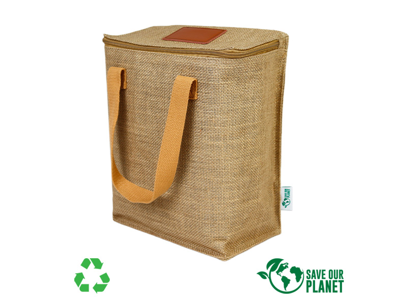 Bolso cooler con exterior de Yute e interior térmico aislante de PEVA y acolchado con esponja PE FOAM. En la tapa, sección superior del cooler, viene con una ventana cosida de eco-cuero, para aplicar logo de manera más elegante.