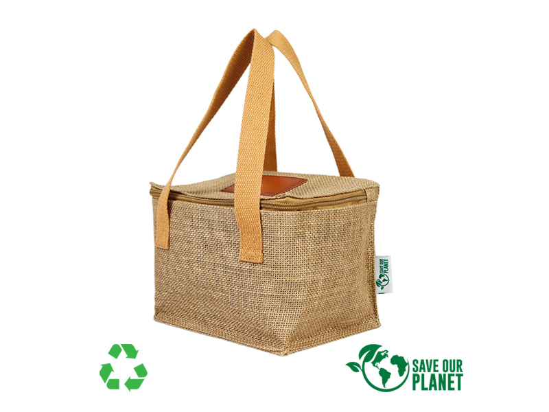 Bolso cooler con exterior de Yute e interior térmico aislante de PEVA y acolchado con esponja PE FOAM. En la tapa, sección superior del cooler, viene con una ventana cosida de eco-cuero, para aplicar logo de manera más elegante.