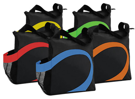 Cooler modelo "Wave". Tela exterior Polyester 70D/PVC. Tela interior plateada aislante 15C PEVA + relleno 3mm esponja PE. Cierre cremallera superior. Incluye bolsillo lateral en tela malla.