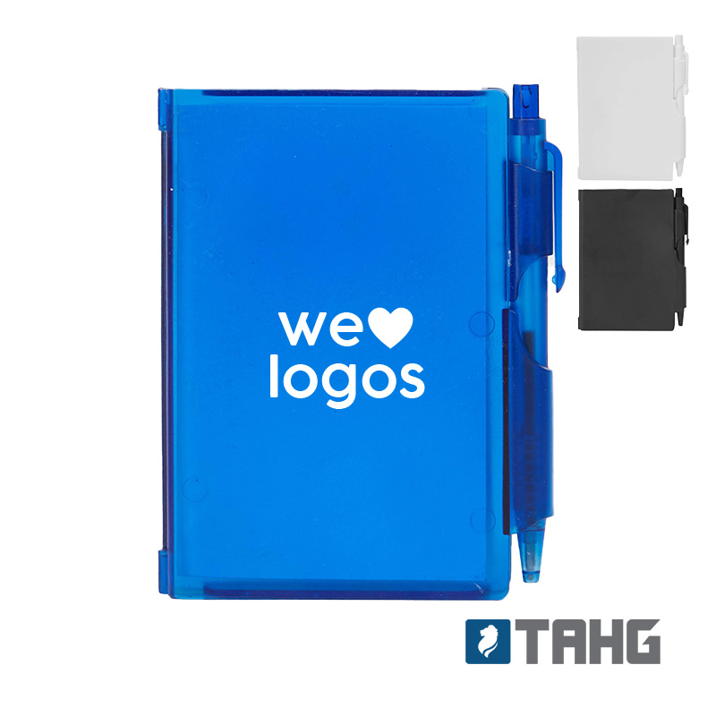 Cuaderno Plástico con tapa dura de PS y porta bolígrafo. 80 hojas lisas. Incluye bolígrafo. Medidas: 10,4 x 7,8 cm. Tahg