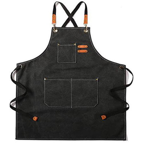 Delantal de mezclilla negra, mosquetones metálicos que se ajustan en los ojetillos del pecho y aplicaciones en cuero tirantes de tela huincha poliéster que van cruzadas en la espalda para pasar por los ojetillos de metal en la cintura y luego terminar para anudar el ajuste en la cintura en la espalda ,fácil para toda persona y cómodamente ajustables ,bolsillos grandes están reforzadas con remaches de metal,. muy elegante.