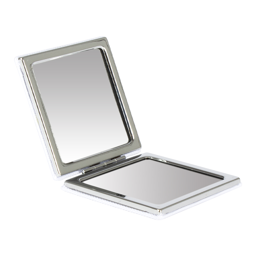 Espejo metálico cuadrado doble, con 2 tapas exteriores recubiertas en poliéster color blanco, para Sublimación. Contiene un espejo normal y el otro con aumento. Sistema de cierre magnético. Presentación en bolsa PP translúcido.