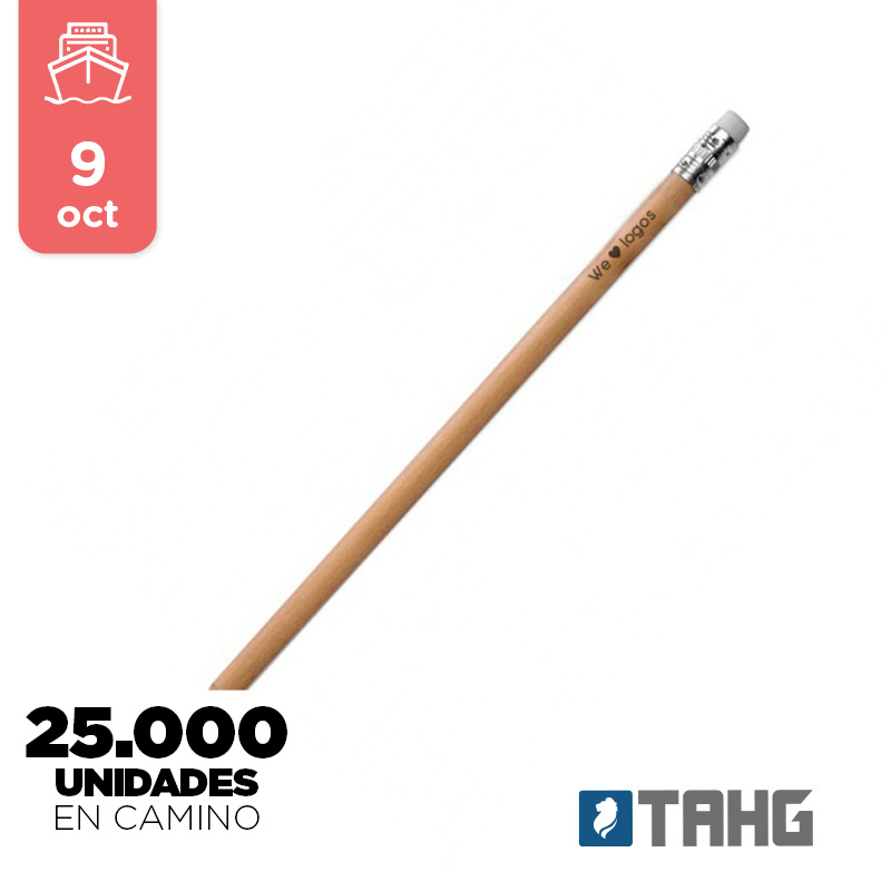 Lápiz grafito con goma. Realizado en madera con detalle de aluminio en reborde de goma. Material de la goma: Caucho. Punta sin preafilar. Medidas: 189 mm x Diámetro 0,8 mm. Mina: 2mm. Tahg