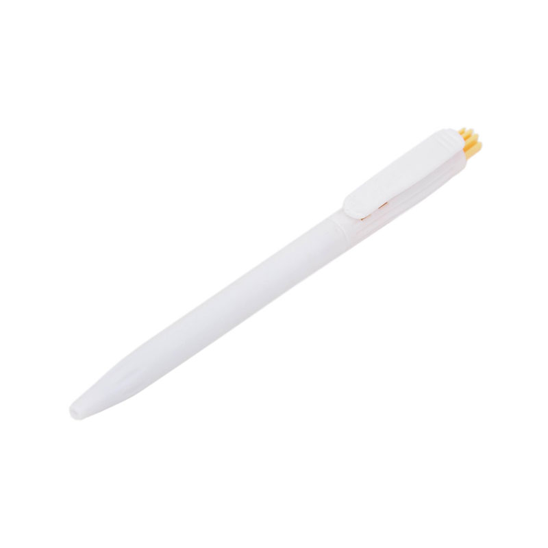 Lápiz confeccionado en ABS, de cuerpo de color blanco y clip en color. Apertura con pulsador. Tinta Azul. Tahg