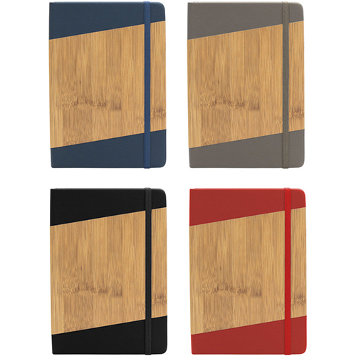 21 x 14 cm. (A5). PU + Papel. Libreta. Tapa dura recubierta en PU, con estampado simil bambú. Interior 80 hojas rayadas en papel de 70 g. Cinta señaladora y cierre con banda elástica del mismo color.