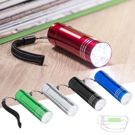 Linterna de 9 ledes de alto poder de iluminación. Con resistente cuerpo en aluminio, pulsador protegido con recubrimiento de resistente goma y cinta de transporte. Alimentación a pilas: 3xAAA no incluidas. Presentada en caja individual. 9 Ledes. 3 Pilas AAA No Incluidas