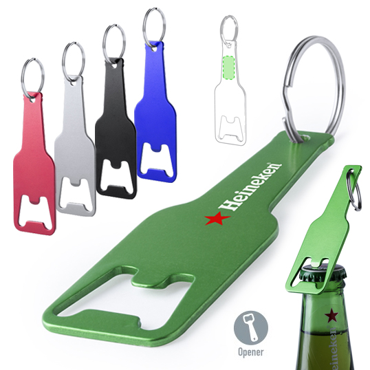 Original llavero abridor en aluminio con diseño de botellín en variada gama de vivos colores metalizados. Especialmente diseñado para marcaje en láser.
