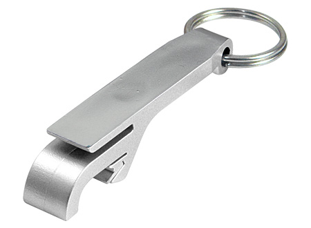 Llavero-Destapador con cuerpo plástico plateado y destapador metálico. Presentación en cajita plateada.