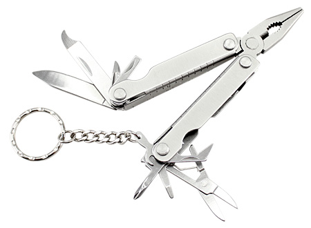 Multiherramienta metálica plegable de 10 funciones, con llavero. Incluye mini-regla en cm y pulgadas. Presentación en estuche de polyester negro y caja plateada de regalo.