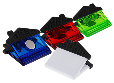 Magne-Clip Grande con forma de Casa y mango de goma negra. Amplia superficie para impresión de logo.