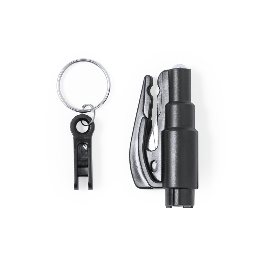Práctico llavero martillo de emergencia, con función rompecristales y cuchilla cortacinturones. Anilla metálica cromada. Presentado en caja individual kraft. 2 Funciones